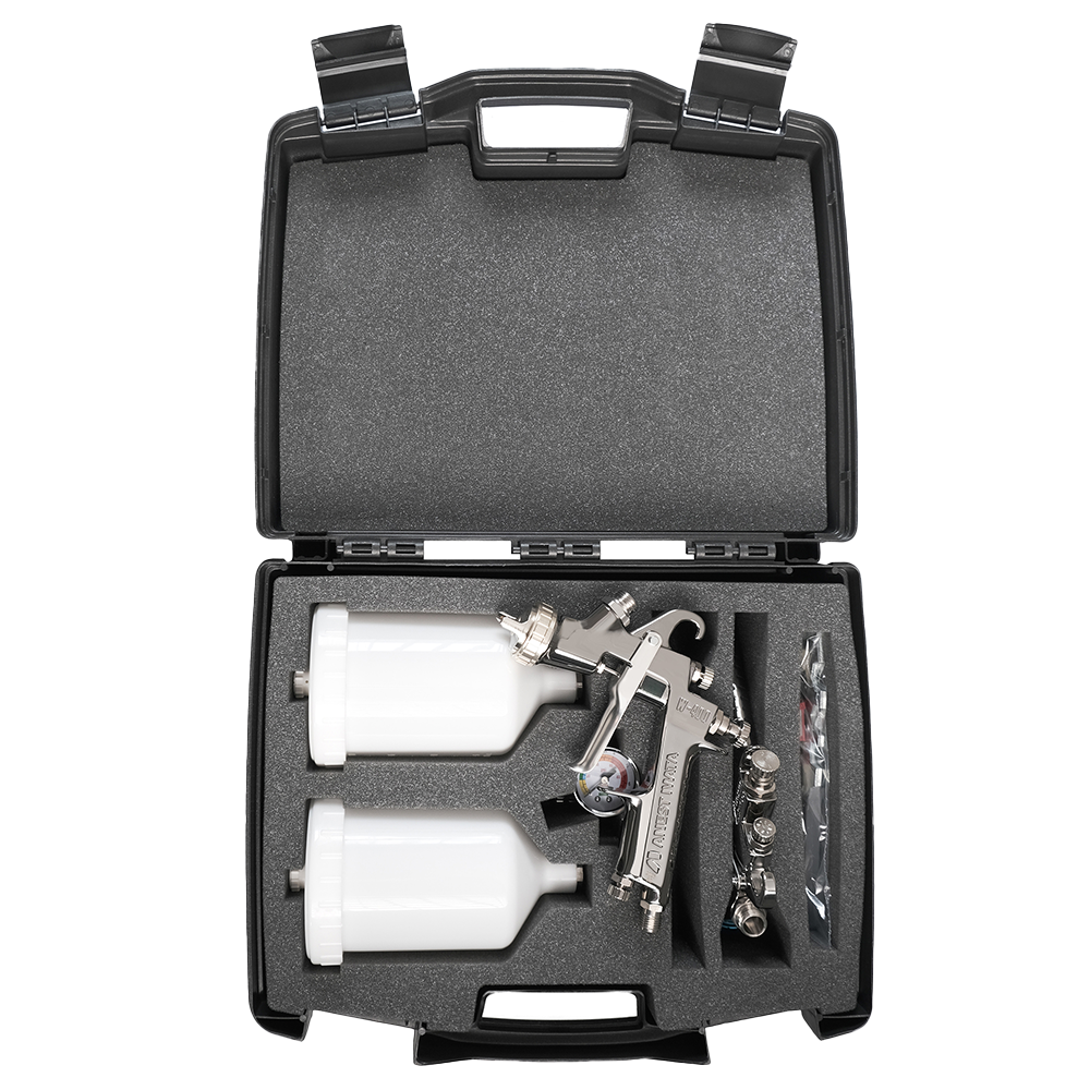 The ANEST IWATA SR2 Kit is a complete spray gun setup designed for high-quality finishing tasks. This kit includes two spray guns, each equipped with a cup for efficient paint application, along with two precision gauges for accurate air pressure control. Additionally, it comes with a cleaning brush to maintain the spray guns and keep them in optimal condition, all organized within a convenient carrying case for easy transport and protection. This professional kit is well-suited for detail work and ensures consistent, smooth finishes across various applications, such as automotive and industrial coatings.